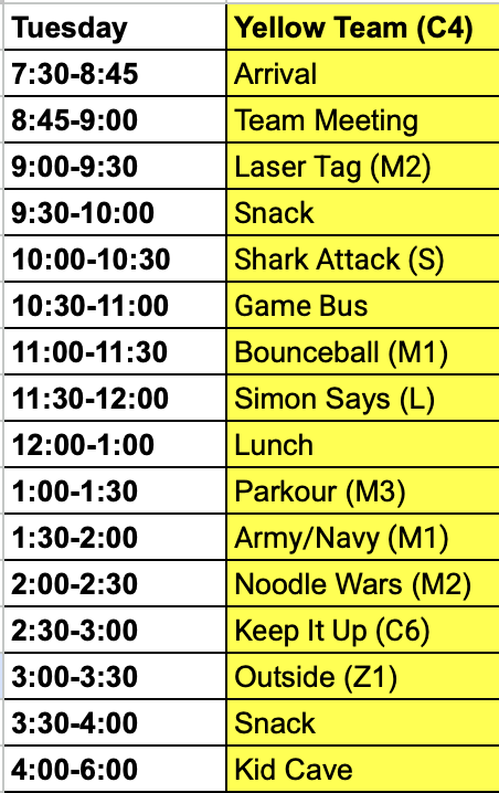 Please text us at 865-272-4853 if your child will be absent so we can mark them off rosters. Team Assignments are completed by our automated system, and moving a camper’s team for them to be with a friend is not allowed as our system assigns team by age. You will receive an agenda each Sunday at 7am with teams and agendas. Be sure to label everything that belongs to your child. Lost and Found will be at the dismissal line on good weather days. Please check the table & Z-Rack consistently. Items are donated on Friday.